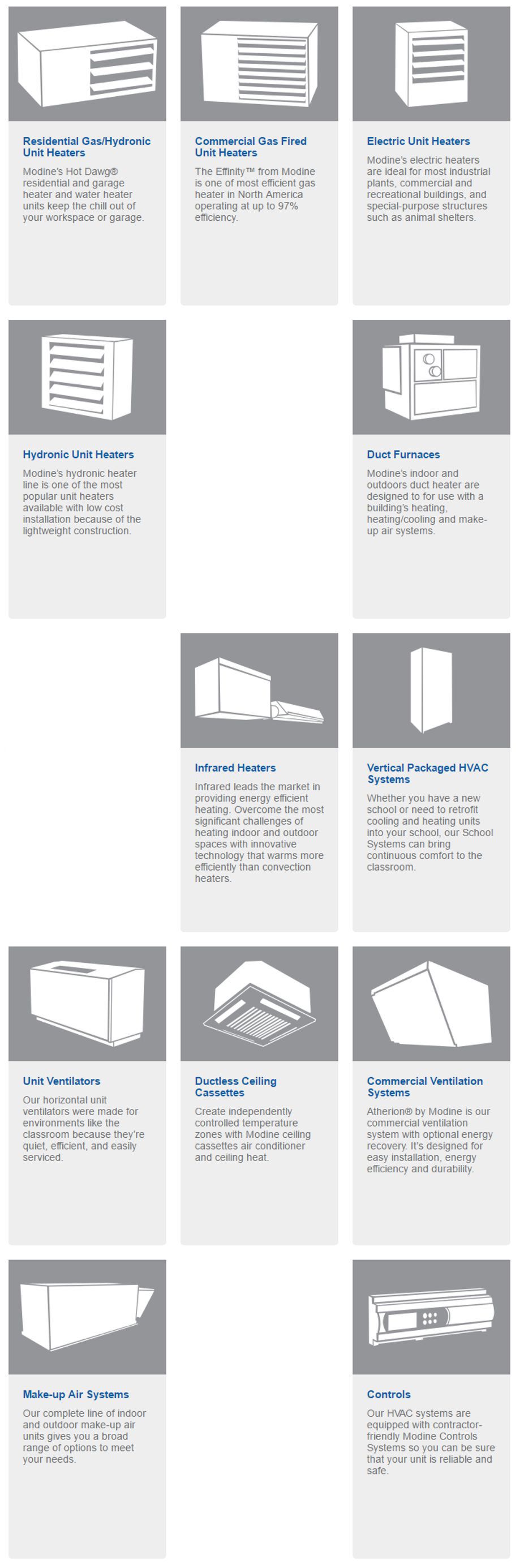 Modine offers a wide variety of heating and air conditioning products including unit heaters, commercial rooftop HVAC systems, geothermal heating and cooling systems, classroom HVAC and more.